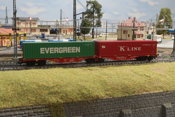 1 sechsachsiges Container-Tragwagen-Paar Typ Sggrss 80 mit einem "'K'Line und einem "Evergreen" Container von Märklin Nr. 47800.