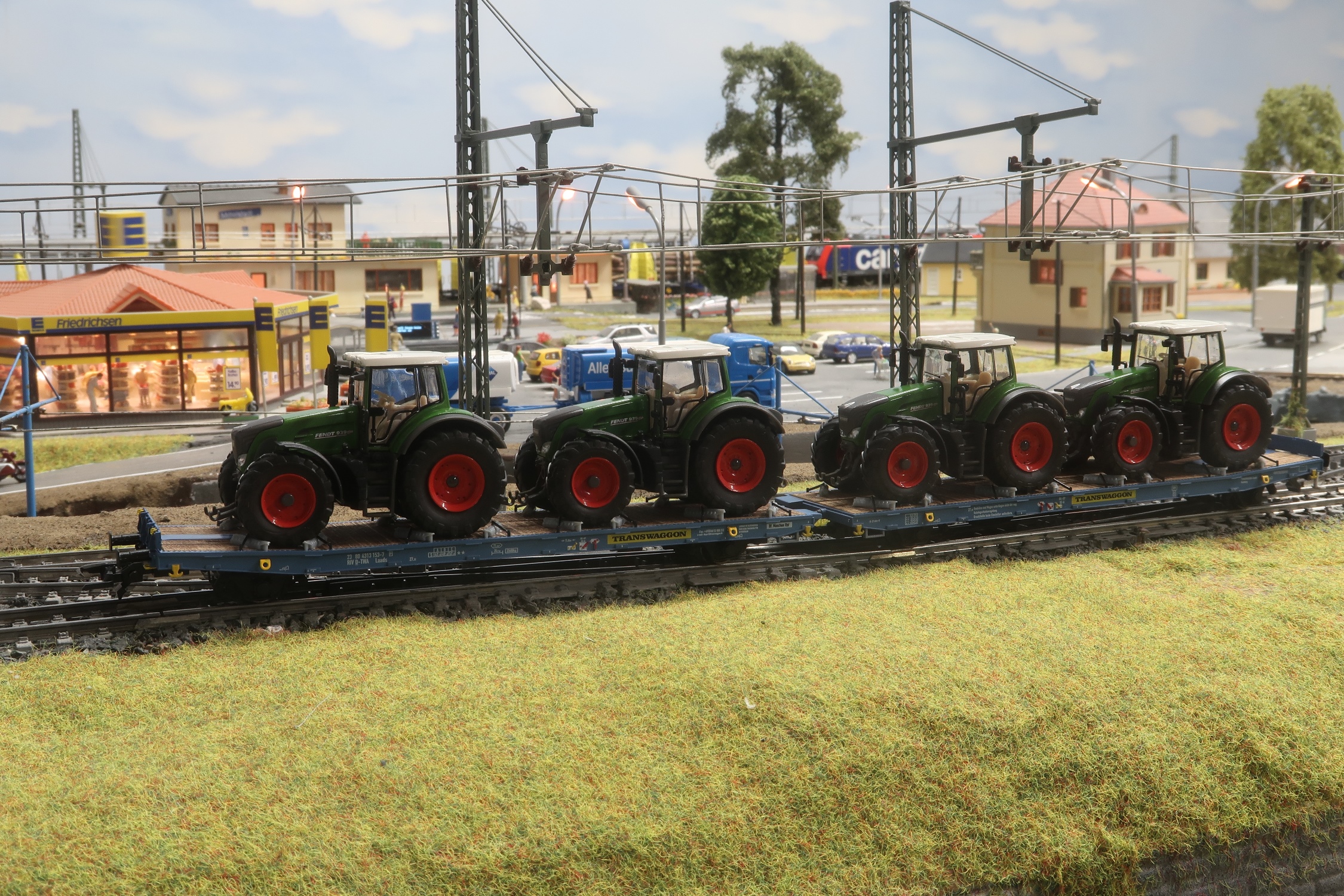 1 vierachsige Flachwageneinheit von NME Nr. 530670 beladen mit vier Traktoren Fendt 939 Vario von Wiking.