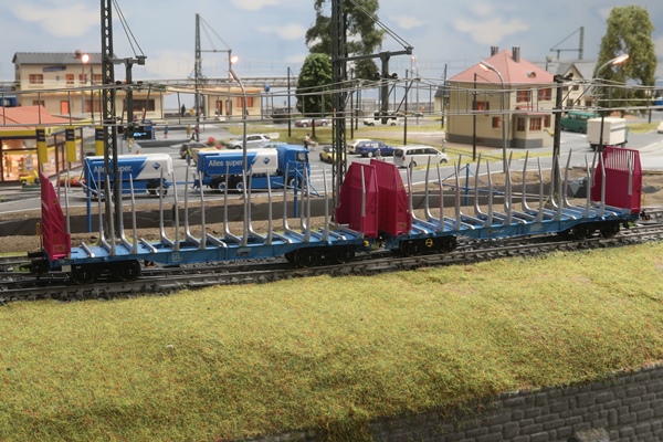 2 sechsachsige Schwerlastwagen von Märklin Nr. 48658 beladen mit je zwei Stahlbrammen.
