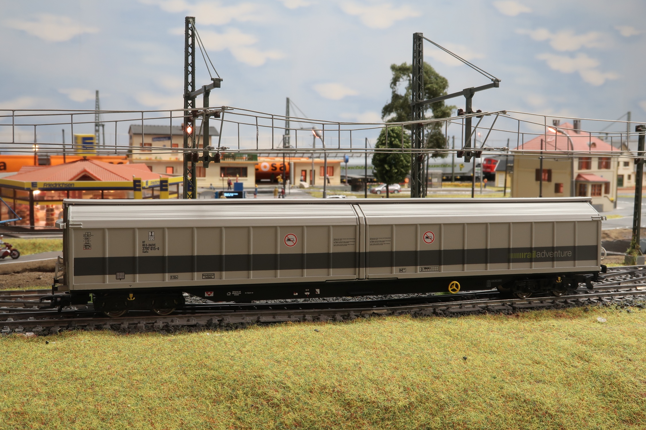 Die beiden Schiebewandwagen in Lackierung des Unternehmens RailAdventure sind von Rivarossi und als Kuppelwagen für Überführungsfahrten im Einsatz.