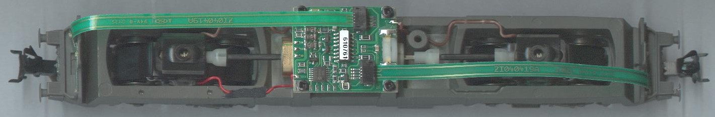 Im Inneren stößt man auf neue Märklin Welten: Ein Decoder sitzt über dem Motor und das Licht wird per flexibler Leiterplatte zu den Leuchtdioden geleitet. Leider wurden, wie immer, gelbe SMD LEDs eingebaut. Diese leuchten fahrtrichtungsabhängig und sind im Digitalbetrieb ein- und ausschaltbar. Einen sehr exakten Modellbahner würde es hier stören, dass das Gelb auch da rausstrahlt, wo eigentlich schon die roten LEDs sitzen müssten. Für den Bastler wird es garantiert eine Möglichkeit geben, die gelben gegen weiße LEDs zu ersetzen und rote LEDs mit einzubauen, denn die Lichtleiter bieten hierfür eine gute Möglichkeit, dadurch, dass sie getrennt (für weiß und rot) eingesteckt sind.