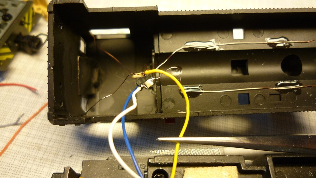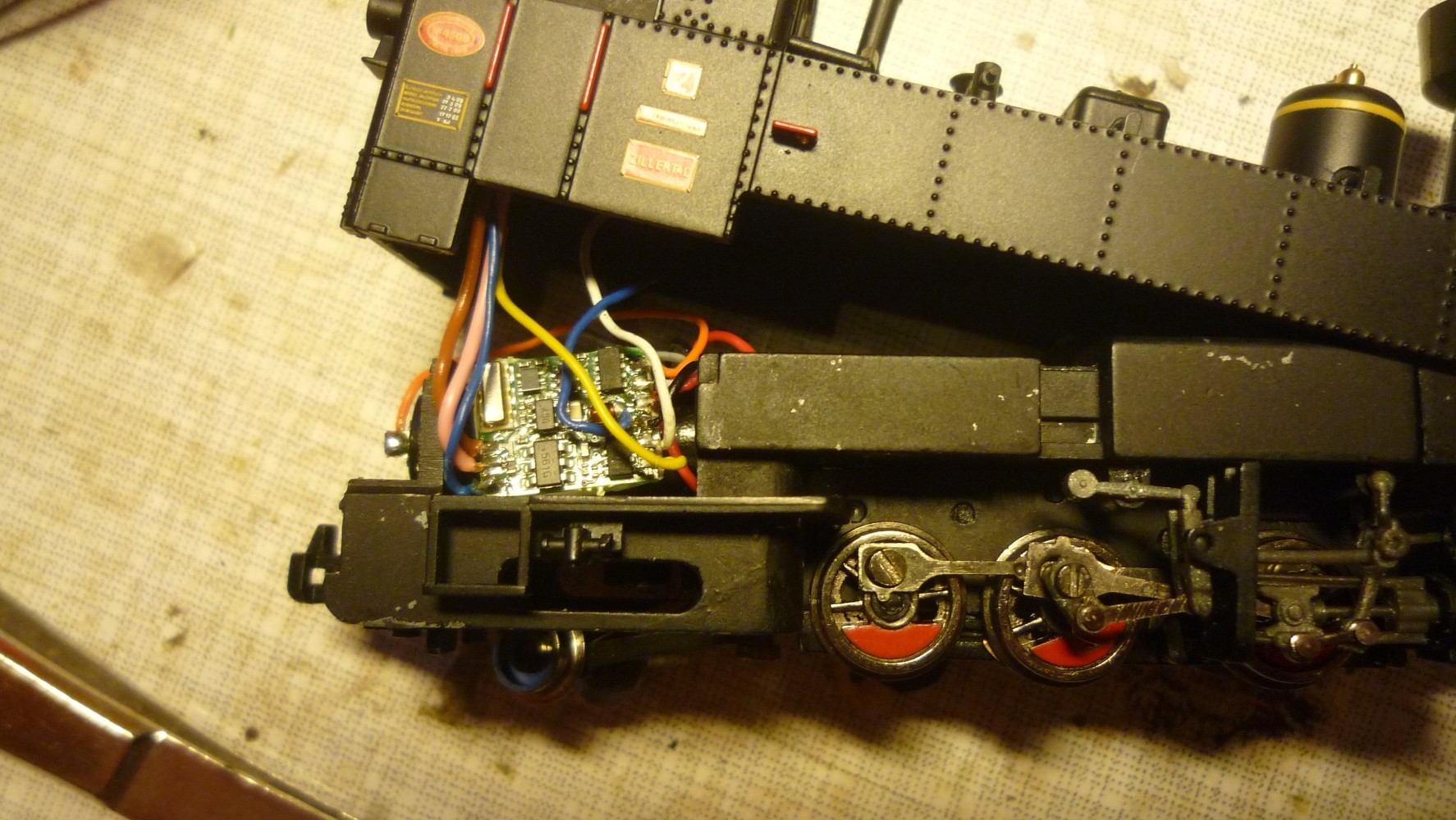 Da die Beleuchtung nun fertig ist, kann ich mich dem Decoder widmen. Er wird dort eingebaut, wo vorher die Motorplatine saß. Diese ist