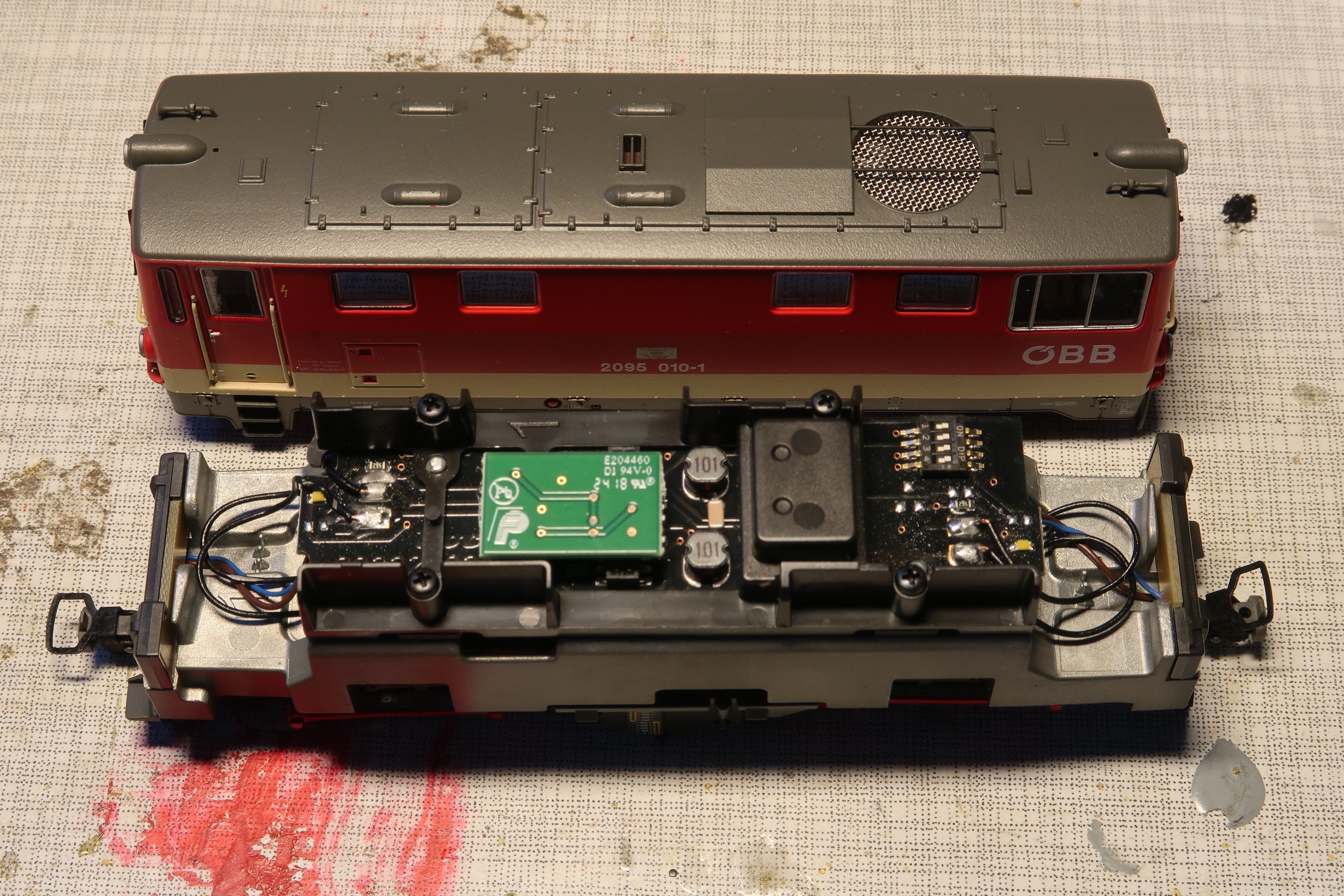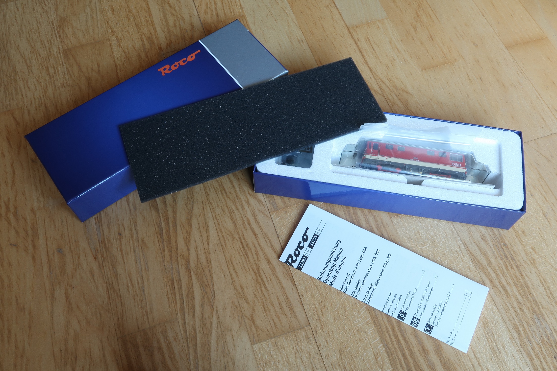 Die Diesellok kommt sorgfältig verpackt mit ein paar Zurüstteilen für die Vitrine und einer Anleitung.