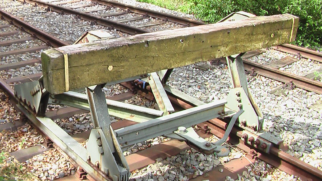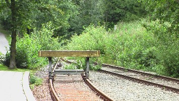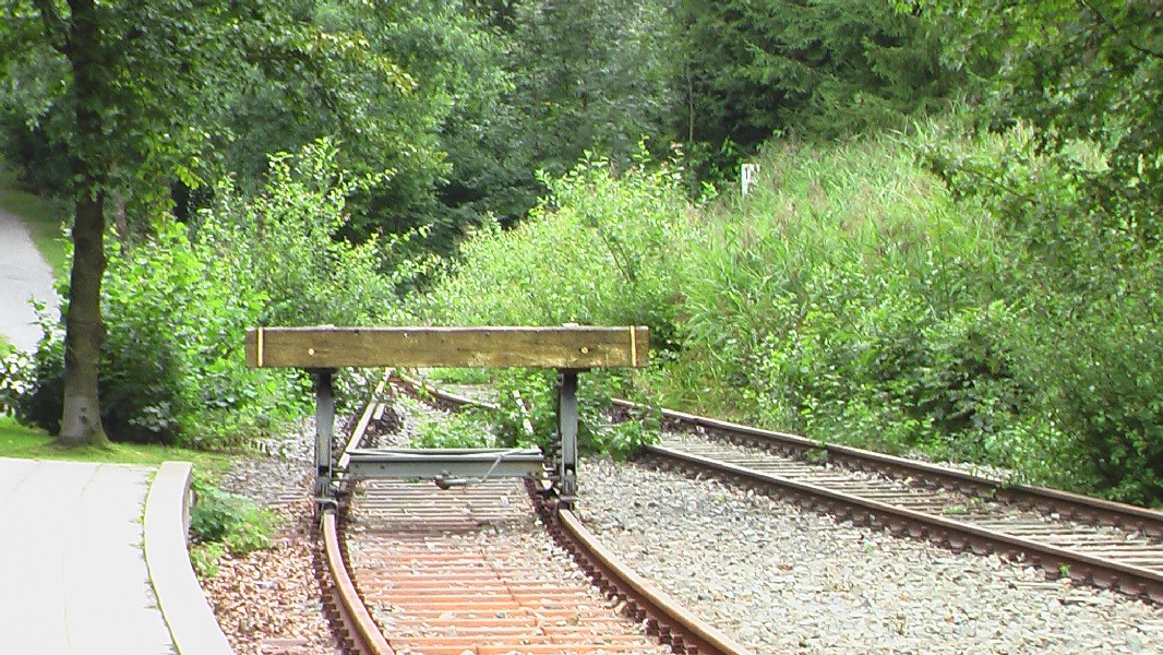 Hinter dem Prellbock liegt noch eine zugewachsene Weiche. Dahinter ist nichts...
