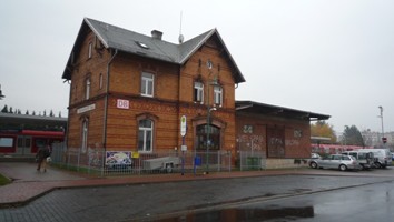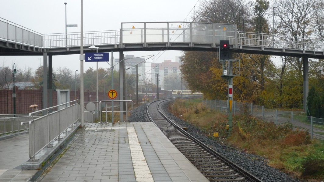 Blick vom südlichen Bahnsteigende zum Bahnhof...