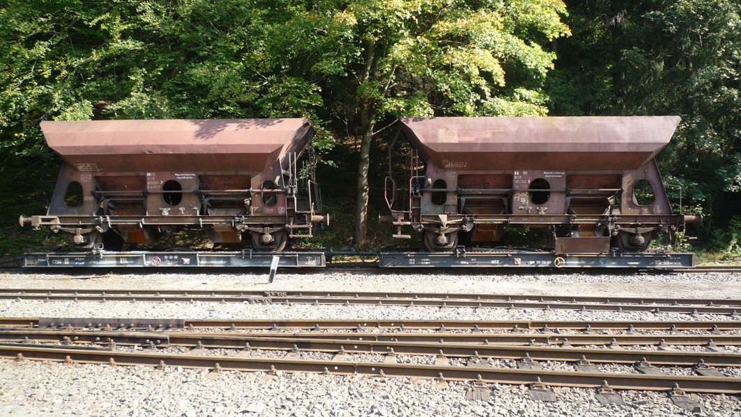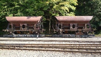 Abgestellte Rollwagen mit normalspurigen Güterwagen.