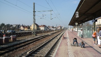 Der Bahnsteig ist so angelegt, dass die S-Bahn nach Heidelberg bereits einige Meter vorher an einem Stumpfgleis zum stehen kommt