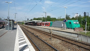Die S 3 endet wegen Bauarbeiten nun bereits in Fürth, nur jeder zweite Zug fährt weiter bis Neumarkt. Wie man sieht kommen auf der S 3 Ersatzfahrzeuge zum Einsatz, die Garnituren bestehen immer aus 4 n-Wagen und einer BR 185 der BASF.