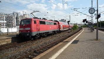 Eine RE Garnitur Würzburg - Frankfurt mit BR 111 und Modus Wagen, wie sie fast immer zum Einsatz kommt, hält am 15.7.2009 in Frankfurt Süd.