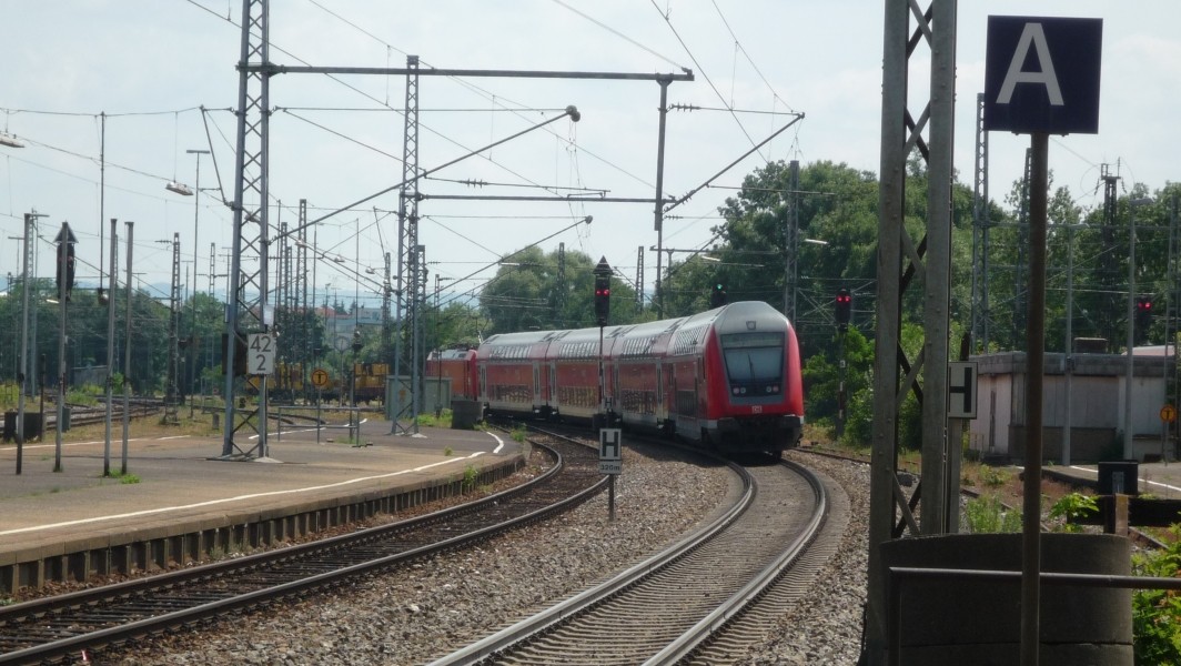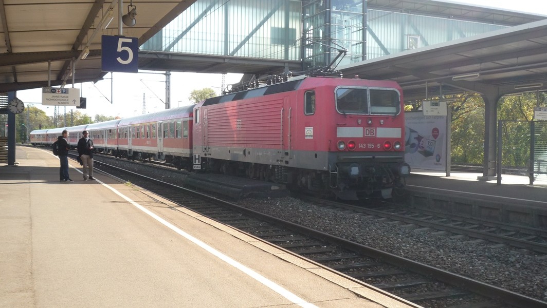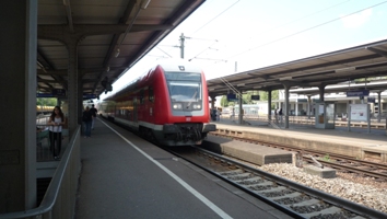 Um 14:08 fährt RE 19223 nach Ulm ein. Der Zug kommt aus Mosbach-Neckarelz und hat in Stuttgart die Linie gewechselt. Er benötigt von