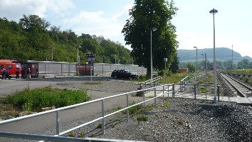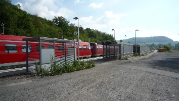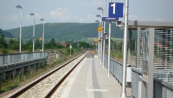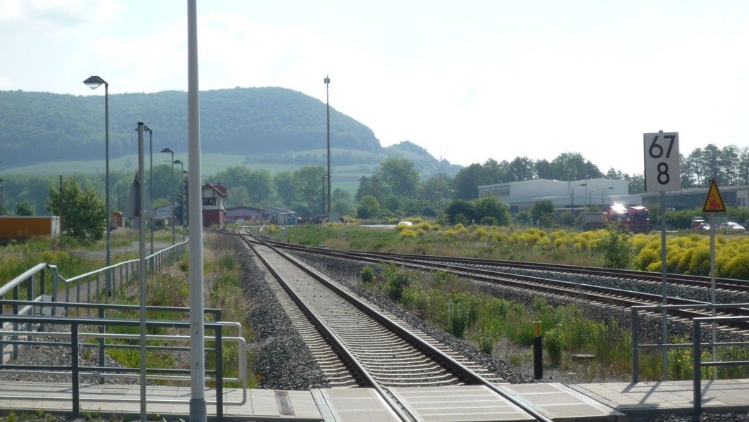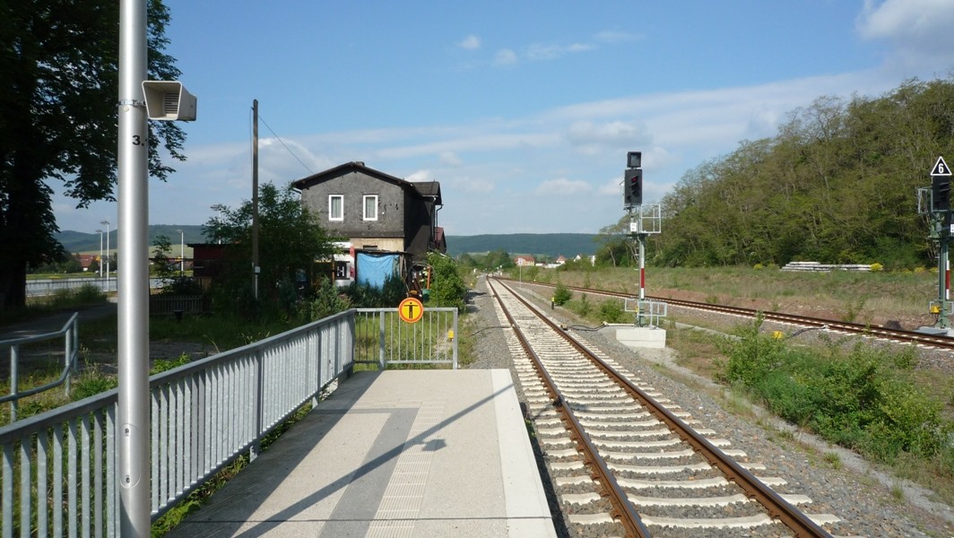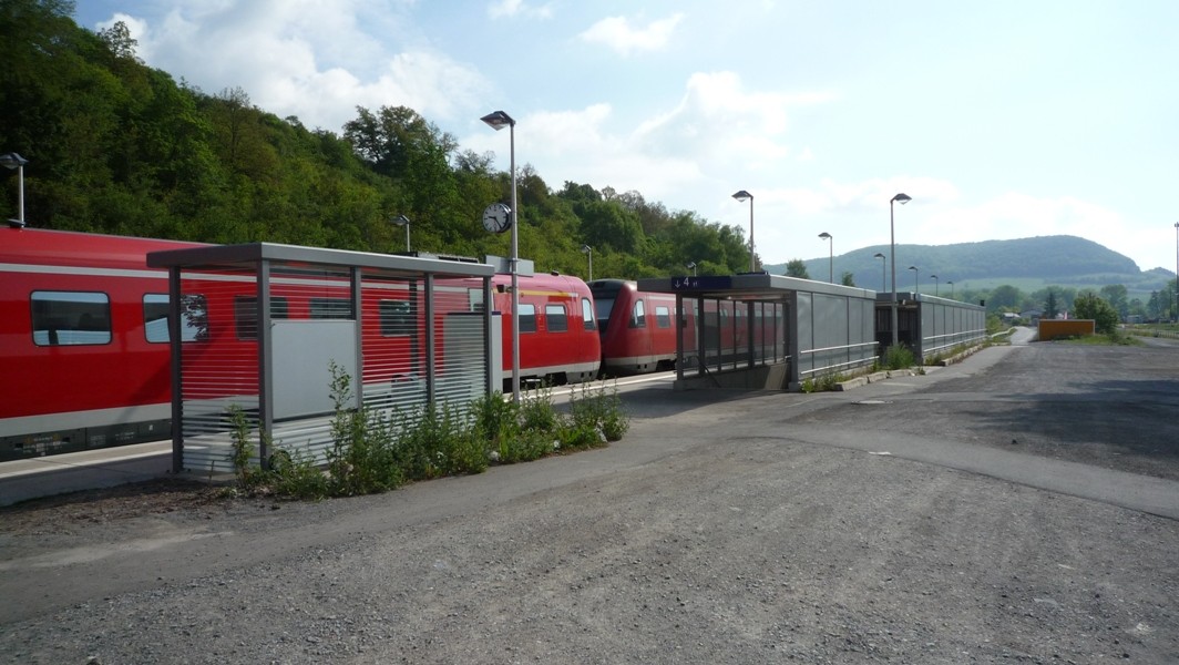 Kleine Info: Der Bahnhof ist zweigeteilt. Südlich vom Bahnhofsgebäude befinden sich die Gleise 1 und 2 (von Gleis 1 fahren die Züge Richtung Eisfeld ab, von Gleis 2 die Züge Richtung Meiningen), nördlich vom Gebäude befinden sich die Gleise 3 und 4 (von Gleis 3 fahren die REs ab, von Gleis 4 die Pendelzüge Grimmenthal - Meiningen und gelegentlich Zugkreuzungen). In Richtung Westen unterquert die Strecke nach Meiningen die Strecke nach Schweinfurt. An den Enden des Bahnhofes sind die beiden Strecken durch Verbindungsgleise miteinander verbunden.