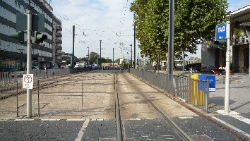 Nach der Haltestelle Böckingen Sonnenbrunnen Richtung Bahnhofsvorplatz wird die Frankenbahn mit Hilfe von Kreuzungsweichen und EKWs gekreuzt.