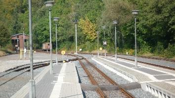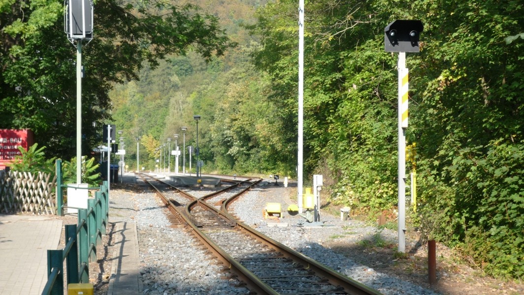 Das Überwachungssignal für Rückfallweichen zeigt "So 18" (zwei weiße Punkte), die Rückfallweiche befindet sich also in Grundstellung und kann spitz befahren werden. Rückfallweichen befinden sich auf so gut wie allen Bahnhöfen der Harzer Schmalspurbahnen, so dass Zugkreuzungen ohne Weichen stellen durchgeführt werden können.