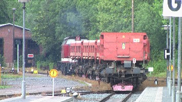 Ausfahrt eines Güterzuges mit einem "Harzkamel" als Zuglok am 15. August 2006.