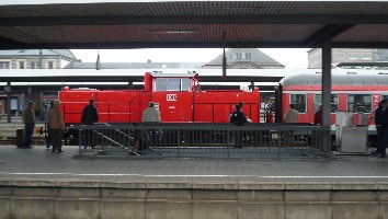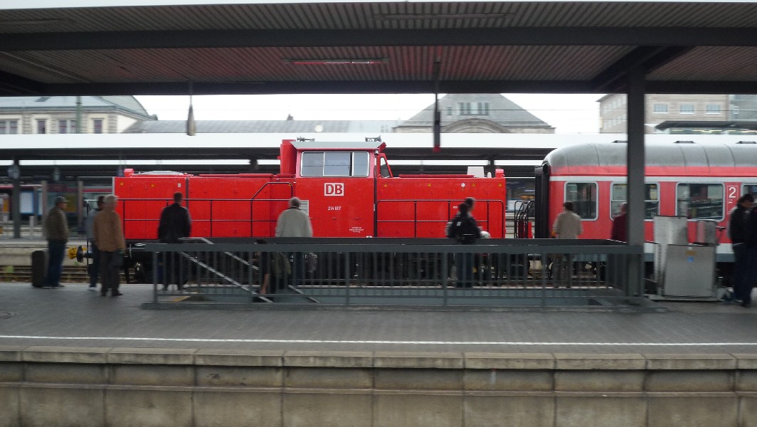 Auf Gleis 23 rangiert eine BR 214. Die Loks wurden von Alstom und der Gmeinder Lokomotivfabrik Mosbach auf Basis der V 100 neu