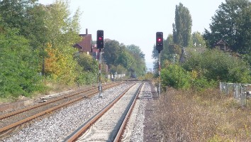 Ausfahrgleise Richtung Halberstadt. Das rechte Gleis mündet wie man sieht in das linke Stammgleis ein.