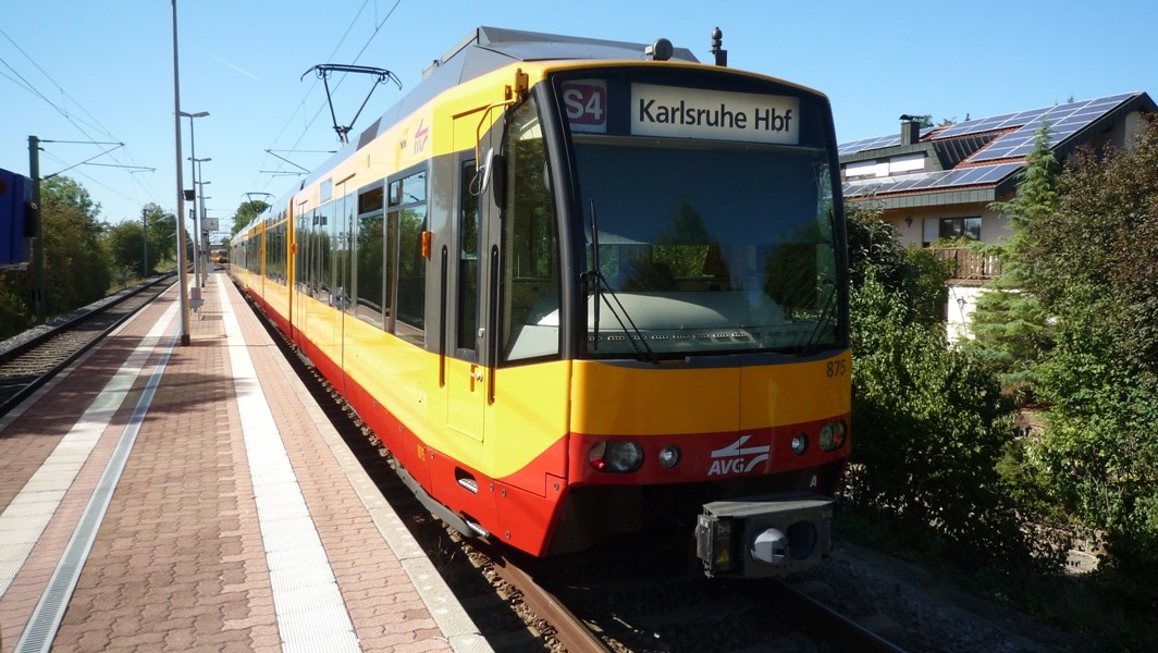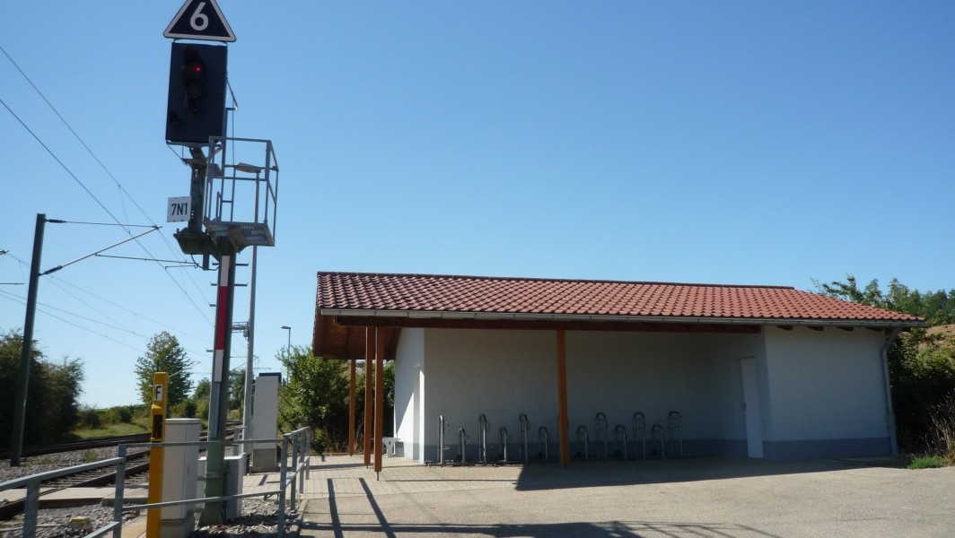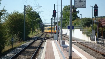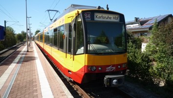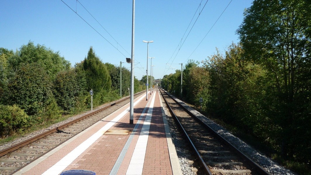 Soeben ist ein Triebwagen aus Heilbronn in Schwaiger West angekommen und fährt nun weiter nach Karlsruhe.