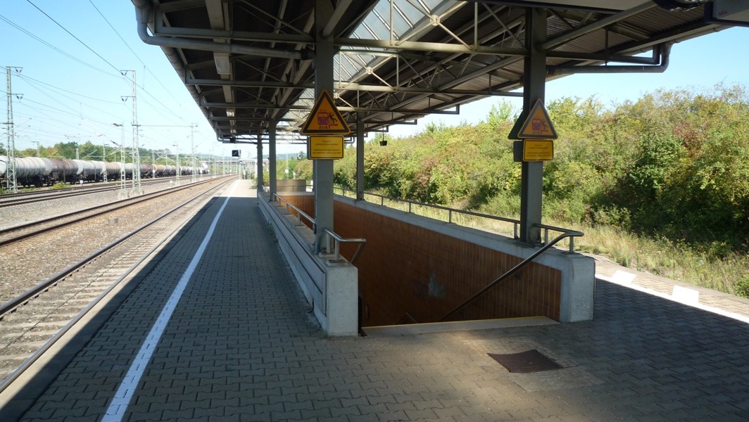 Bruchsal mündet von der Seite her an die Schnellfahrstrecke. Bahnsteige besitzen die Gleise 1 und 2 (Halt für Züge Richtung Stuttgart und