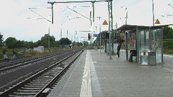 Der Inselbahnsteig ermöglicht ein einfaches Umsteigen zwischen den Zügen der UBB und dem RE. Alle drei Bilder zeigen die Strecke Richtung Stralsund.