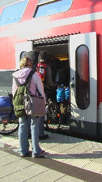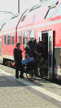 An den Wochenenden sind diese Züge von Fahrradtouristen sehr besucht, so dass es häufig schon mal an den Türen zu solchen Engpässen kommt.