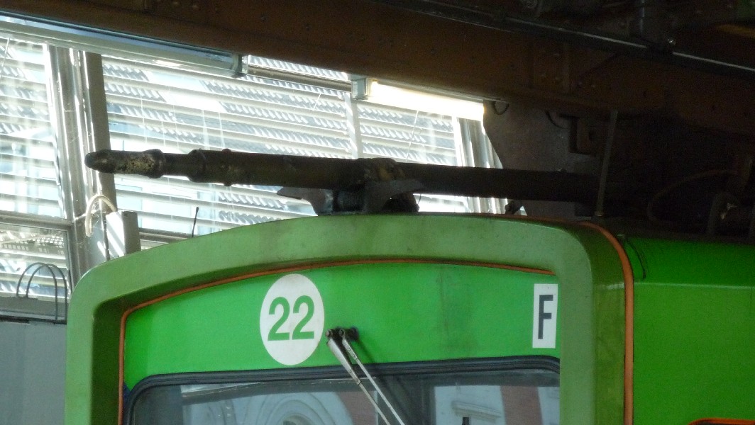 Die Antriebseinheit ist drehbar am Wagendach befestigt. Außerdem befinden sich Stromabnehmer am Antrieb.