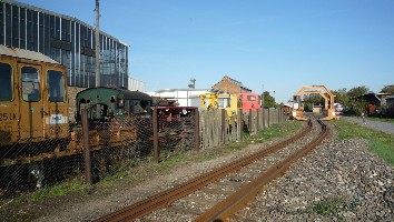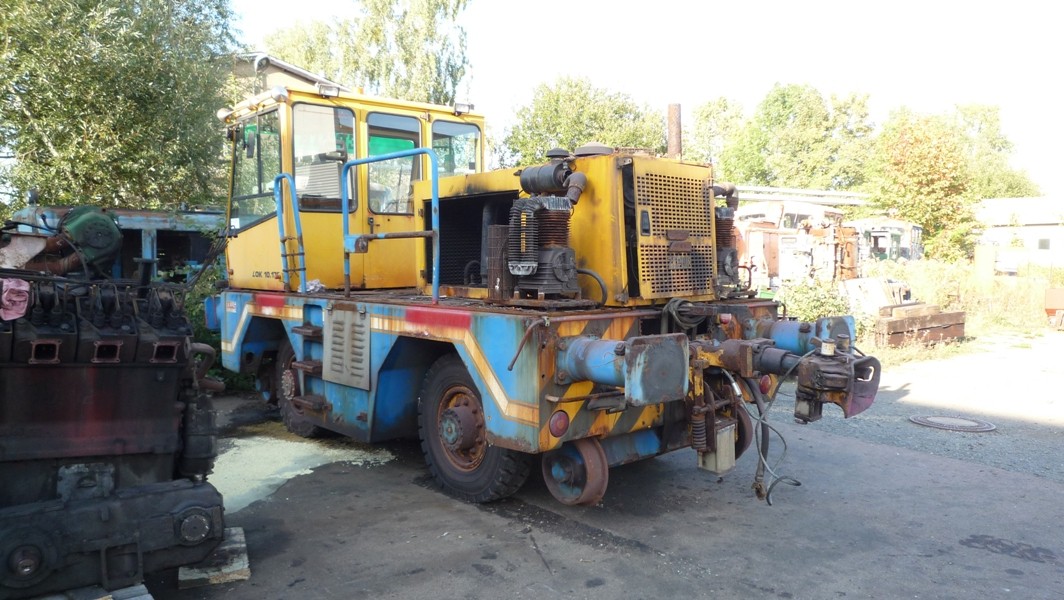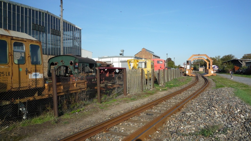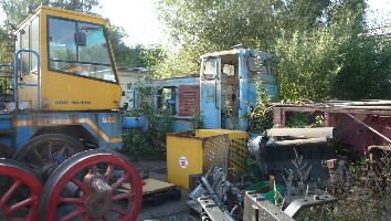Zahlreiche normalspurigen Dieselloks sind auf dem Nachbargleis abgestellt. Zumindest die ersten drei Fahrzeuge sehen noch fahrtüchtig aus.