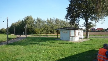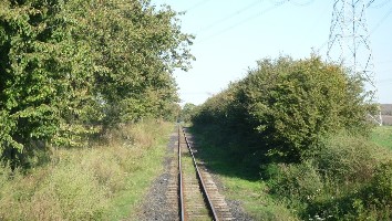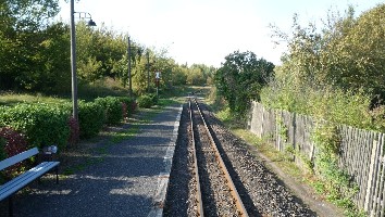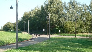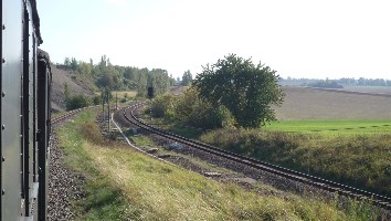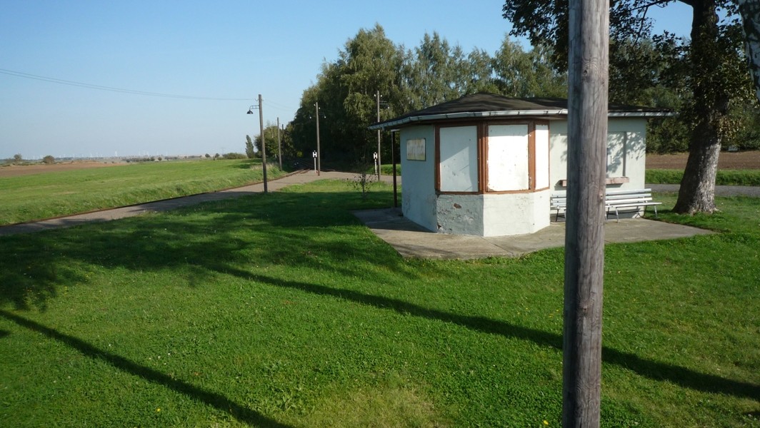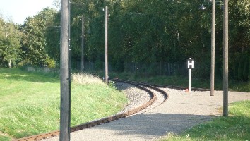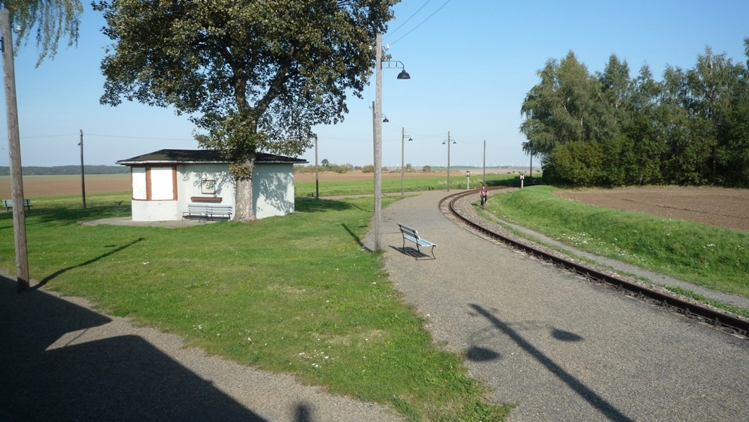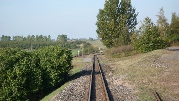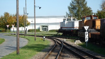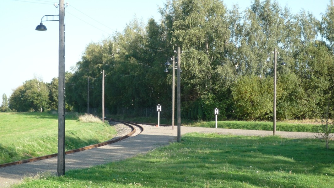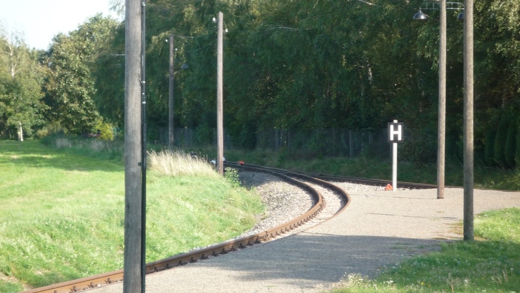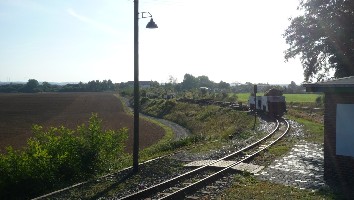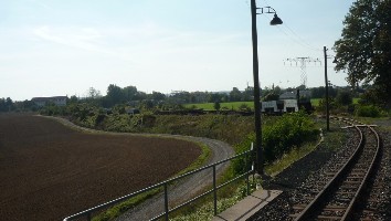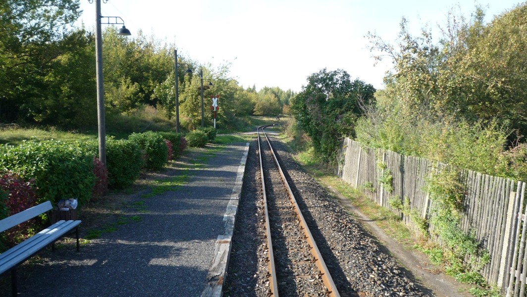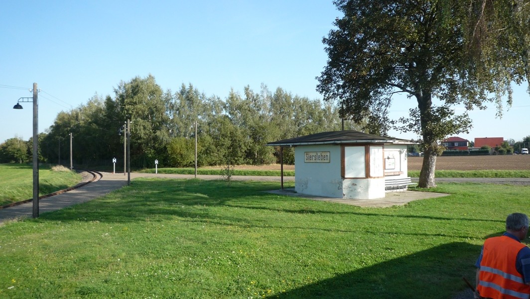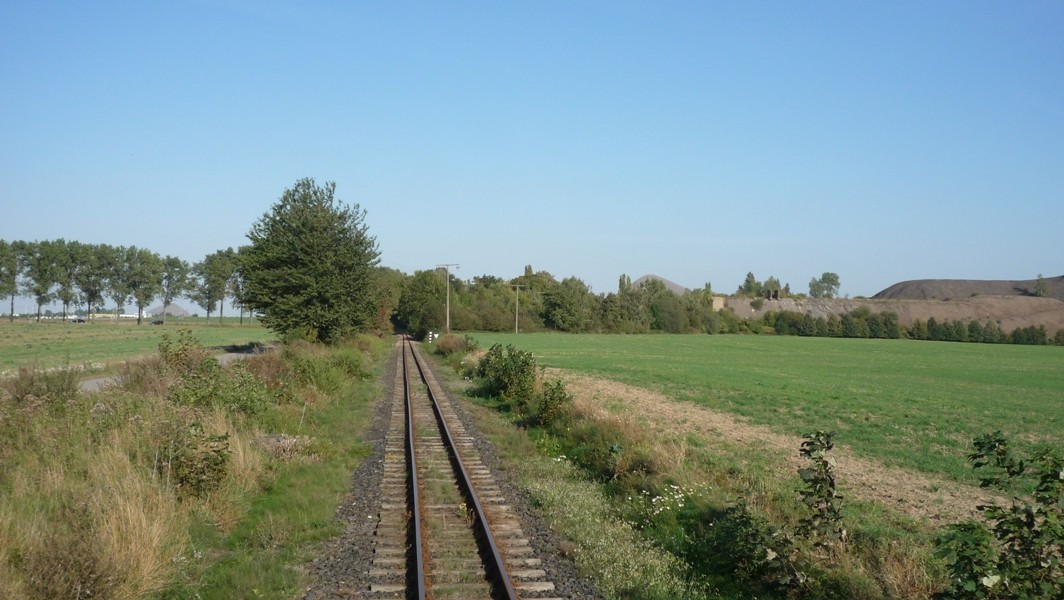 Die Bergwerksbahn trifft nun wieder auf die DB Strecke, früher gab es hier für beide Bahnen einen Haltepunkt, bei der Schmalspurbahn hieß er "Paradies", bei der normalspurigen Bahn "Siersleben".