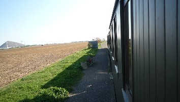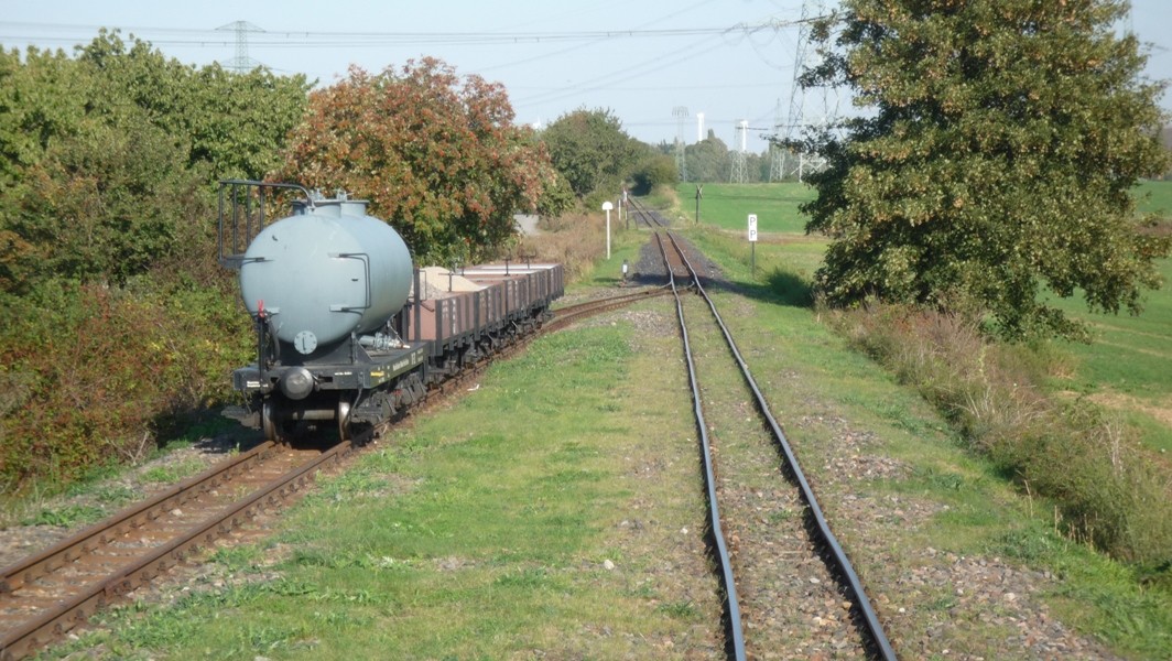 Gleich nach der Überquerung der DB Strecke mündet ein langes Abstellgleis in die Strecke. Viele verschiedene Wagen stehen hier rum.