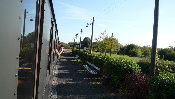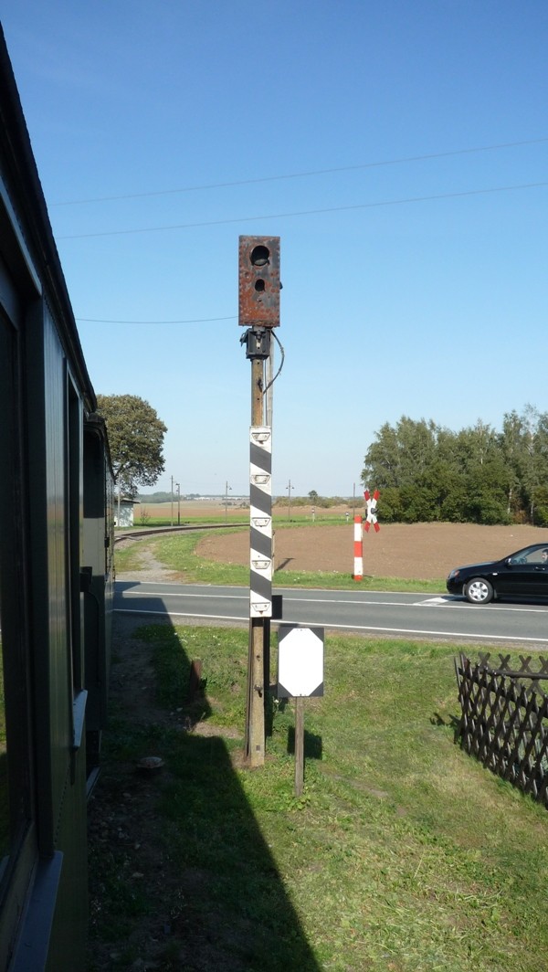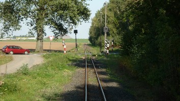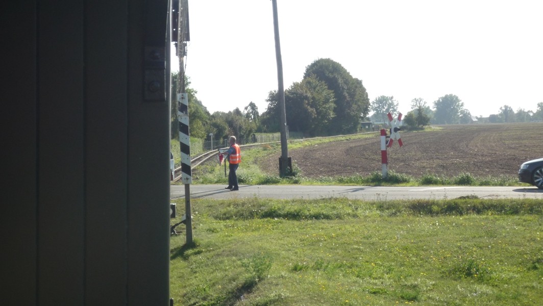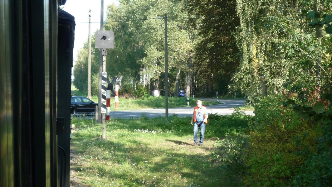 Der Bahnübergang muss, wie fast alle auf der Strecke, mit einer Fahne gesichert werden, wenn ein einfaches Pfeifen nicht genügt.