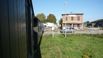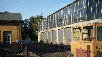 Das Gelände ist relativ groß, es gibt ein Anschlussgleis (im Bild sichtbar), so dass auch die Normalspurfahrzeuge den Bahnhof anfahren können. Schmalspur und Normalspur ist aber getrennt, Mehrschienengleise gibt es erst im Bereich der Werkstatt.