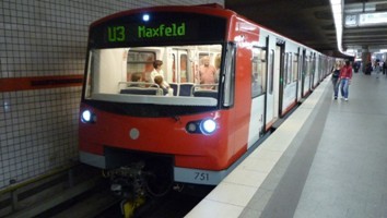 Führerlose DT3 Triebwagen auf der U2 und U3 beim Halt im Hauptbahnhof.