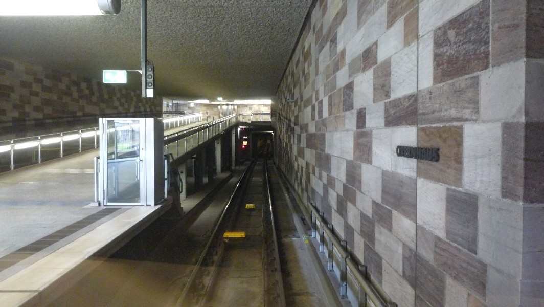 Haltestelle Opernhaus als Lokführerperspektive in einem DT3 Triebwagen.