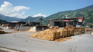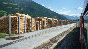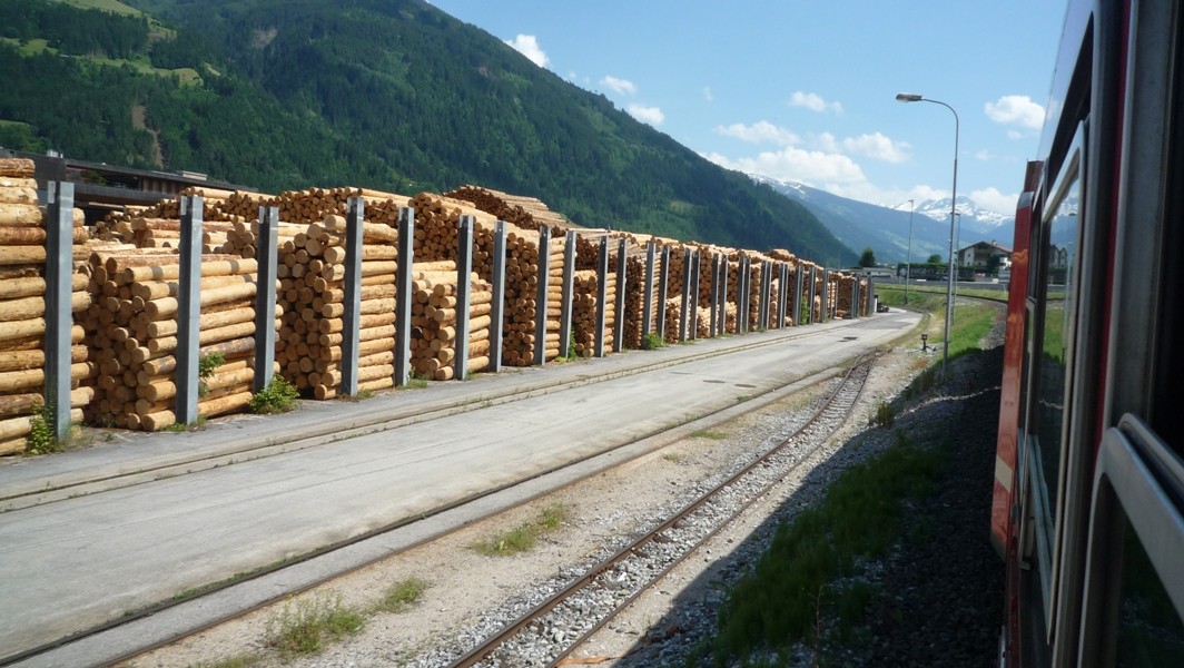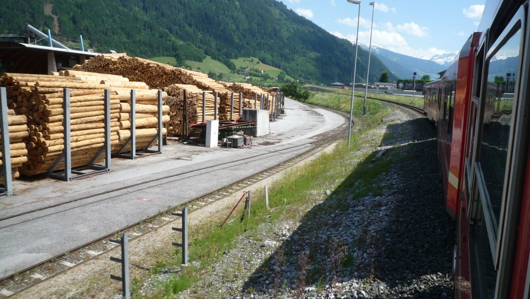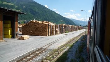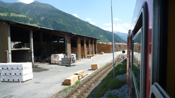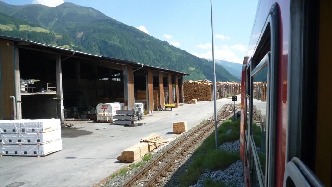 Wenige hundert Meter nach dem Bahnhof führt eine Weiche zur Binderholz GmbH. Dort sieht man oft Rollbockwagen mit