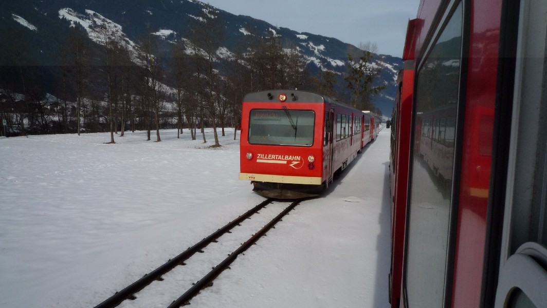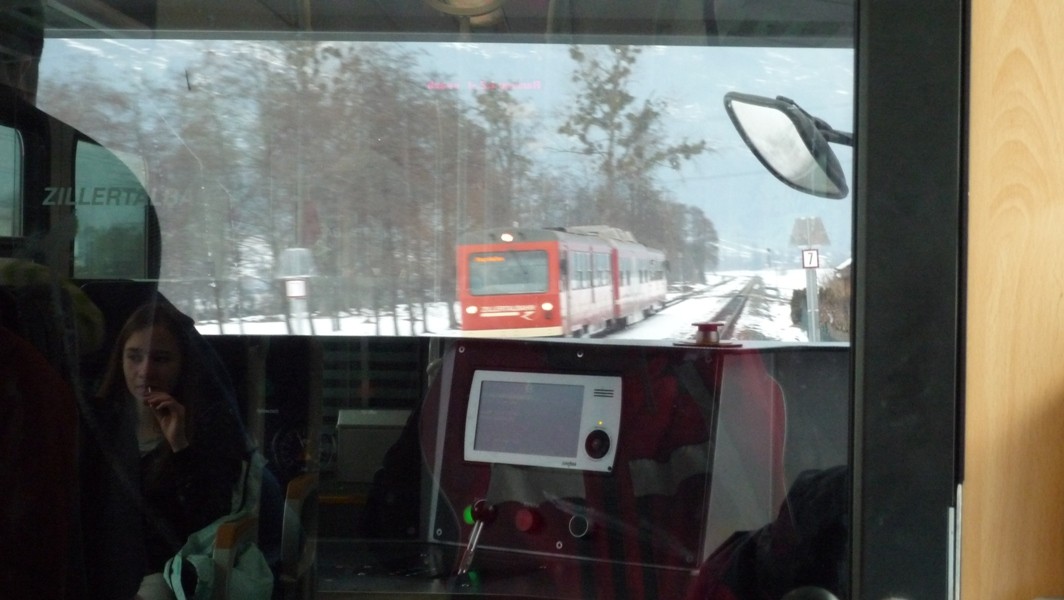 Bild ist vom ausfahrenden Zug kurz hinter Ramsau-Hippach heraus fotografiert, der nun nach Jenbach fährt. Auf dem anderen Gleis fährt ein Zug nach Mayrhofen.